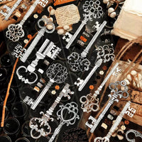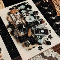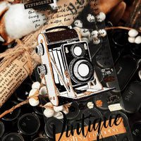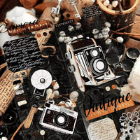 Dieses dekorative Washi-Tape aus PET im Vintage-Stil präsentiert klassische Retro-Elemente wie altmodische Kameras, Grammophone, antike Schlüssel und Briefmarkenmotive.