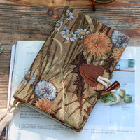 Ce bullet journal présente une couverture en tissu ornée de plantes d'automne comme des pissenlits et des marguerites, présentées dans un style de peinture à l'huile qui respire une touche d'élégance vintage.