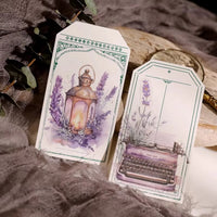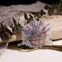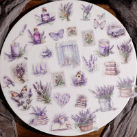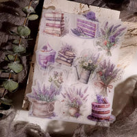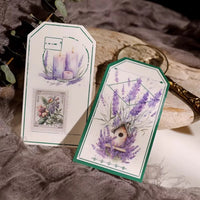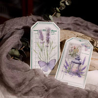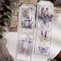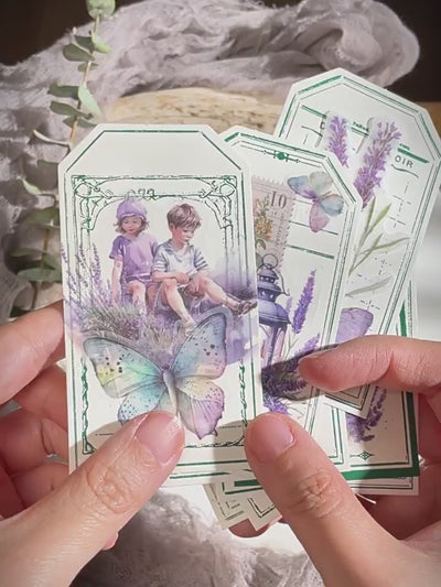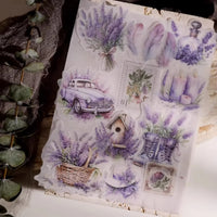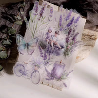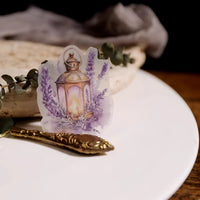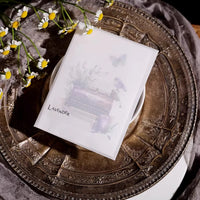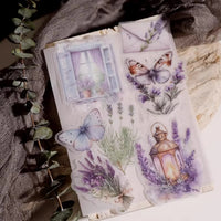 Cet ensemble d'autocollants en vélin sur le thème de la lavande présente de délicates illustrations dans des tons violets doux, notamment des scènes de fenêtres, des bouquets de lavande et des papillons. L'impression à l'encre blanche sur du vélin translucide crée un effet onirique et superposé.