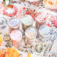 Ce ruban adhésif décoratif à motifs floraux et botaniques s'inspire des couleurs douces et de la beauté naturelle du printemps. Le motif met principalement en valeur des roses.