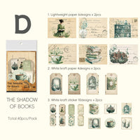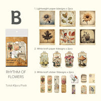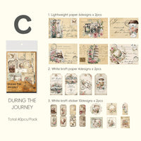 各パッケージには、軽量紙 12 枚 (6 デザイン x 2 枚)、白クラフト紙 8 枚 (4 デザイン x 2 枚)、白クラフトステッカー 20 枚 (10 デザイン x 2 枚) を含む、40 枚の紙とステッカーのエフェメラキットが付属しています。