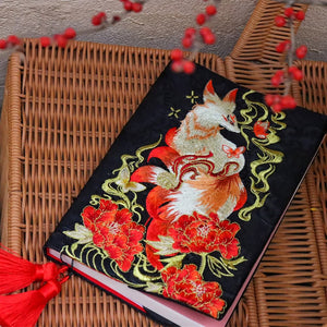 Step into a world of elegance and tradition with this exquisitely embroidered A5 binder and notebook cover, featuring a striking red fox design. Crafted from luxurious fabric using a gradient embroidery technique, the design shimmers beautifully in the light and offers a silky-smooth feel.