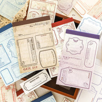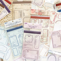 Each sheet includes intricate labels, borders, and motifs with a nostalgic, antique style. The designs showcase soft, muted colors such as beige, lavender, blue, and tan brown, with delicate detailing like butterflies, florals, and retro ticket stubs.