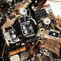 This vintage PET decorative washi tape showcases classic retro elements including old-fashioned cameras, gramophones, antique keys, and stamp designs.