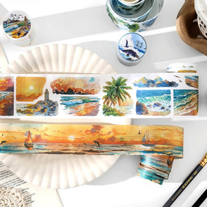 This captivating series of washi tapes features a mesmerizing seascape theme, inspired by the beauty of watercolor paintings. The collection includes six stunning landscape designs: swaying coconut trees by the ocean, Crazy waves and charming shells, vibrant sunsets over the water, idyllic island vistas, rolling waves, fishing boats silhouetted against the dusk sky. The refreshing and warm color palette evokes the tranquility and beauty of nature. Use this versatile tape to add a touch of artistic charm to your art journal, scrapbook, greeting cards or DIY projects.